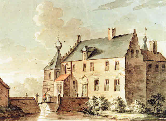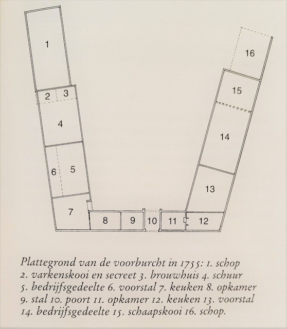 Het bij het kasteel behorende poortgebouw met de beide vleugels werd vroeger wel aangeduid als neerhuizing of voorburcht. In 1640 werd het kasteelcomplex omschreven als "het steenen huys in water met dobbele grachten, met een voorgeborchte daerinne staet eenen peertstal ende schuyre met andere huysen". In de achttiende eeuw is de beschrijving van de voorburcht iets preciezer: "Een groot voorhoff off bassecour, die ruym en groot is, waarin staat een koetshuys, paardestal, schuur, backhuys en neerhuysinge off hoeve met stallinge voor runderbeesten, en schuuren, etc".