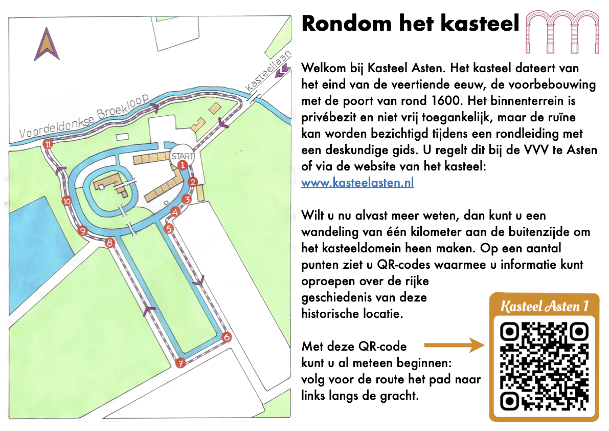 Komt u zomaar aan bij het kasteel dan staat u wellicht verrast aan de poort. Staat hier een kasteel? Jazeker, hoewel... het kasteel is vervallen tot een ruïne, een heel mooie ruïne. Heeft u geen bezoek geregeld dan kunt u toch alvast wat meer te weten komen over de rijke geschiedenis van Kasteel Asten.